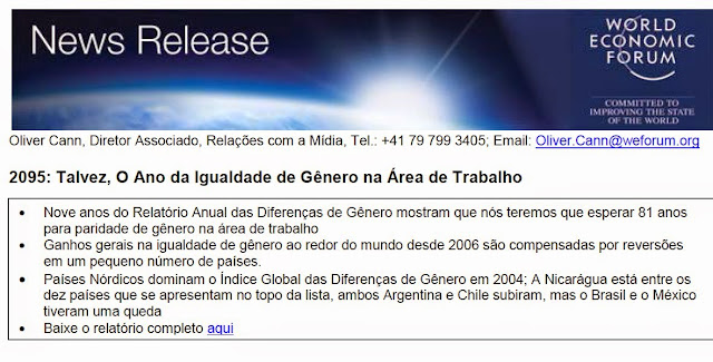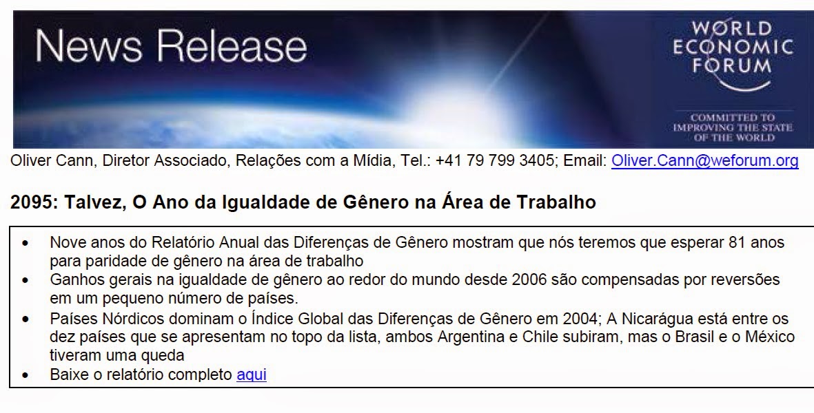 «Genebra, Suíça, 28 de Outubro de 2014 – Em nove anos avaliando as diferenças globais entre gêneros, o mundo viu apenas uma pequena melhoria com relação à igualdade da mulher na área de trabalho. De acordo com as Diferenças Globais entre Gêneros de 2014, lançadas hoje, as diferenças entre gêneros para oportunidade e participação econômica é de 60% em todo o mundo, fechando em apenas quatro por cento dos 56% em 2006, quando o Fórum começou a avalia-las. Baseado nessa trajetória, com todo o resto permanecendo igual, levará 81 anos para o mundo fechar essa fenda completamente.